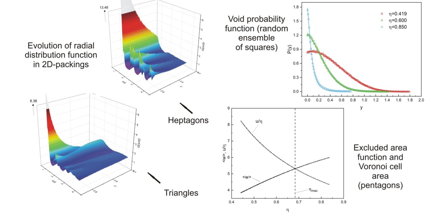 В работе исследованы статистико-геометрические характеристики случайных упаковок одинаковых правильных многоугольников (с числом вершин от 3 до 7) на плоскости в квадратном боксе со стороной L. Начальный ансамбль генерировали методом случайной последовательной адсорбции. Финальный ансамбль получали путем поэтапного увеличения линейных размеров двухмерных частиц согласно алгоритму Любачевского−Стилинжера.