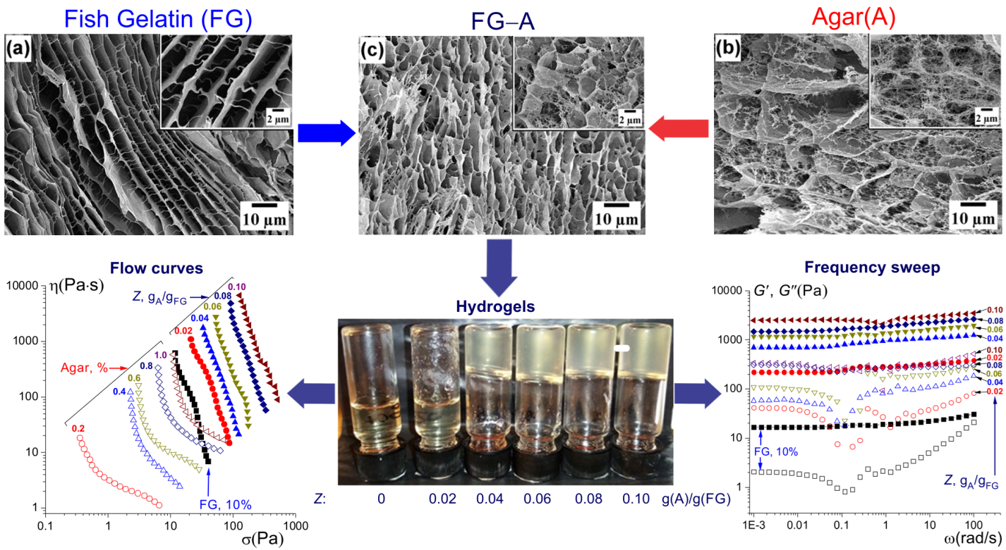 Методами ДСК, СЭМ и 3D-реометрии исследовали влияние концентрации агара СА на коллоидно-химические свойства комплексных гидрогелей рыбный желатин–агар. Гидрогели были сформированы при постоянном содержании желатина (10%) в диапазоне массовых соотношений биополимеров Z от 0.02 до 0.10 гА/гРЖК. Показано, что добавка агара вызывает ускорение гелеобразования рыбного желатина примерно в 2 раза. При этом желатин увеличивает температуру гелеобразования, но не влияет на температуру плавления агаровой компоненты геля. Агар в 13–14 раз увеличивает теплоту плавления, не влияя на температуру плавления желатиновой компоненты геля. Комплексный гидрогель характеризуется уплотненной структурой с уменьшенным размером ячеек по сравнению с гелями отдельно взятых биополимерных компонент. Микроструктура геля представляет собой ячеистую сетку желатина, «армированную» волокнами сетки агара. Прочность и упругость комплексного геля при увеличении СА существенно возрастают, синерезис уменьшается. Установлено оптимальное соотношение биополимеров Z=0.08 гА/гРЖК, при котором гидрогель рыбный желатин–агар обладает упруго-прочностными характеристиками, сравнимыми с желатином из свиной кожи, а также устойчив к плавлению и синерезису во время хранения при комнатной температуре.